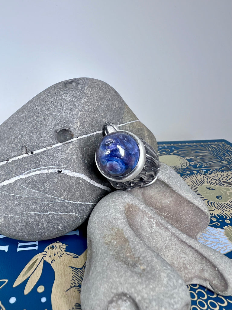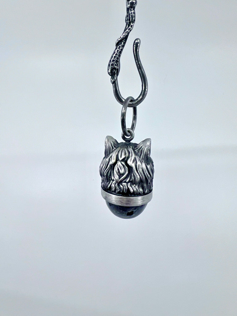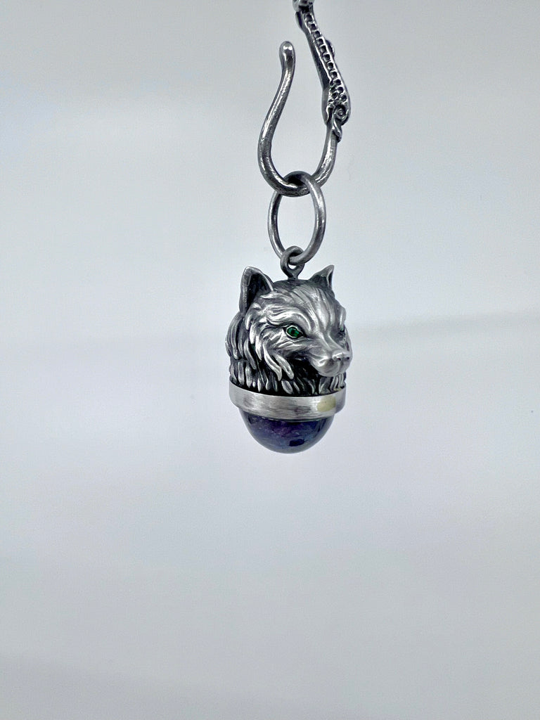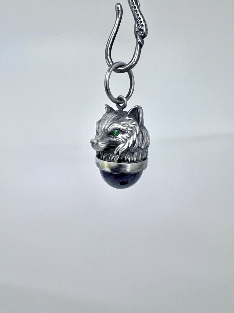 Adorable Wolf Cub in all sterling silver (for durability), blue sapphire matrix, and green diamond eyes.