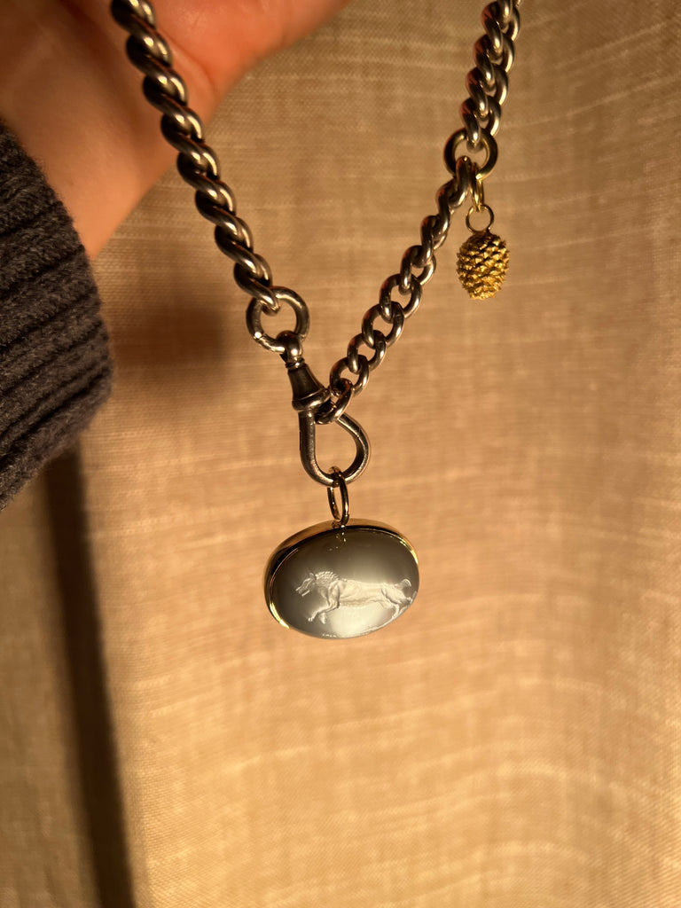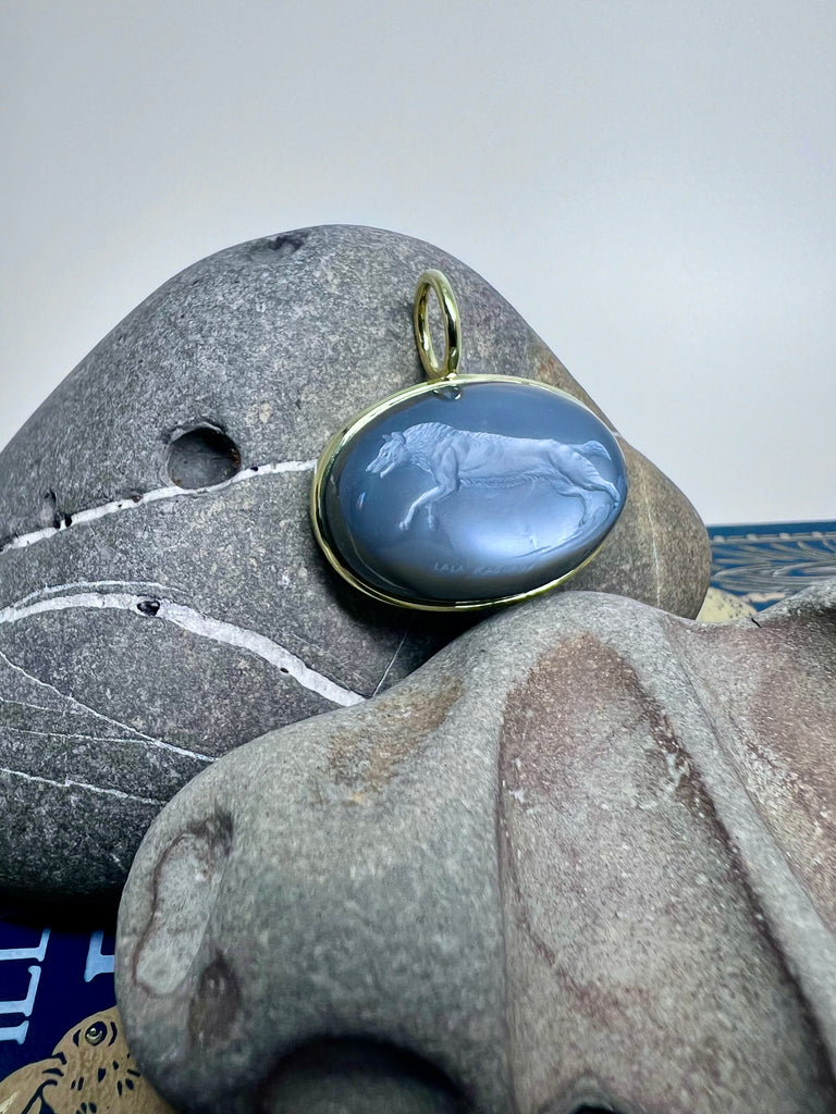 Gorgeous high dome smokey gray moonstone hand carved with a leaping Wolf by the brilliant Lala Ragimov set in an 18k gold east-west frame.